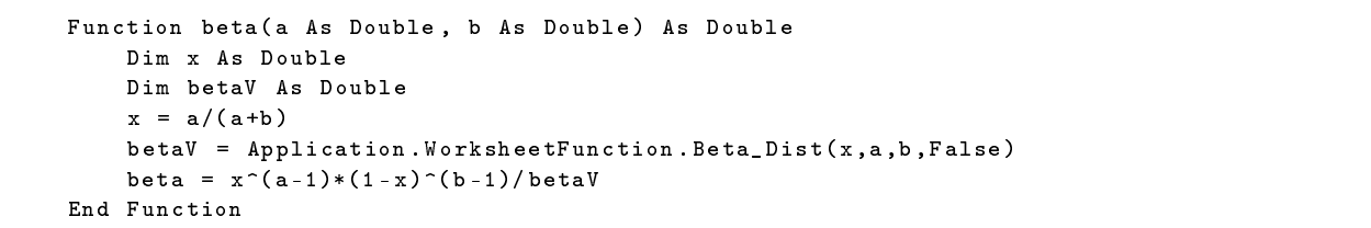 Die Umsetzung der Beta-Binomialvetrteilung in Excel hängt im Wesentlichen von der Beta-Funktion \(B(\alpha,\beta)\) ab. Diese ist in Excel nicht verfügbar, kann aber über einen Umweg über die Betaverteilung berechnet werden. Als VBA-Code ist die Beta-Funktion damit