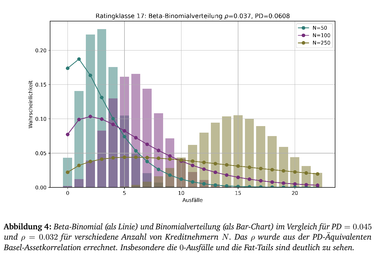 Die in Basel III beschriebenen Korrelationen (vgl. (BIS CRE 2023)) sind Assetkorrelaionen. Das für Basel verwendete 1-Faktormodell ist ein Firmenwertmodell, das als Faktor die Abhängigkeit zum systematischen Markt benutzt. Um diese für das Beta-Binomialmodel zu nutzen, müssen diese in Default-Korrelationen umgewandelt werden. In (Andreas Henking 2006), 6.1.3, pp. 166-167 wird hierzu eine Formel angegeben. Diese ermöglicht es, das Beta-Binomialmodell konsistent zur vorgegebenen Eigenmittelunterlegung zu verwenden.