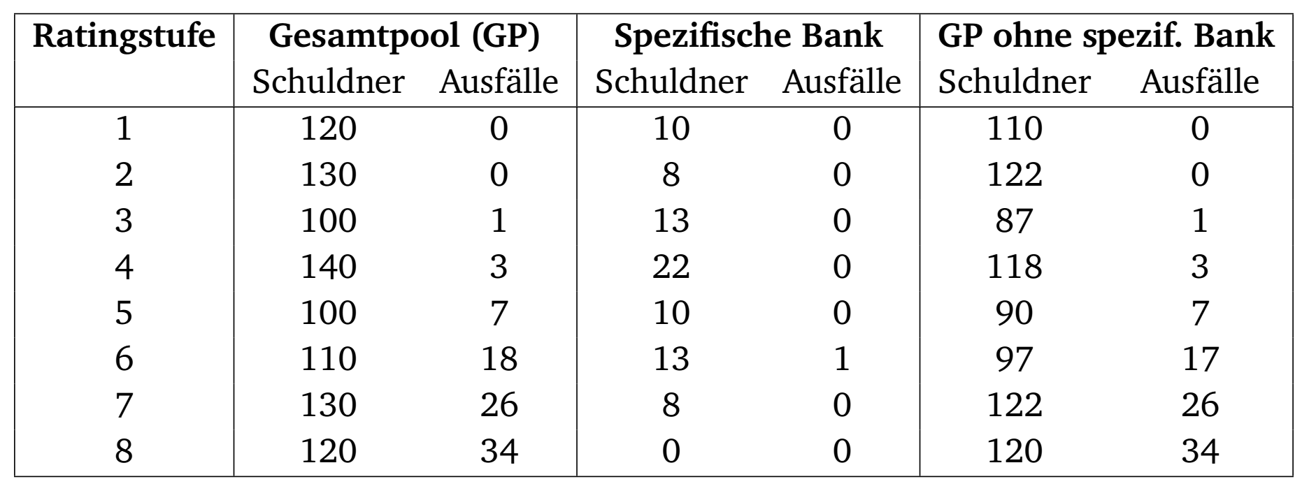 Als Vergleichspool wird der Gesamtpool ohne die spezifischen Bankdaten verwendet. Nachdem in den ersten beiden Ratingklassen keine Ausfälle im Vergleichpool auftraten, werden die ersten 3 Klassen zusammengefasst. Die spezifische Bank hat keine Schuldner in Ratingklasse 8. Diese wird daher nicht betrachtet. Die Kontingenztabelle hat damit folgende Form: