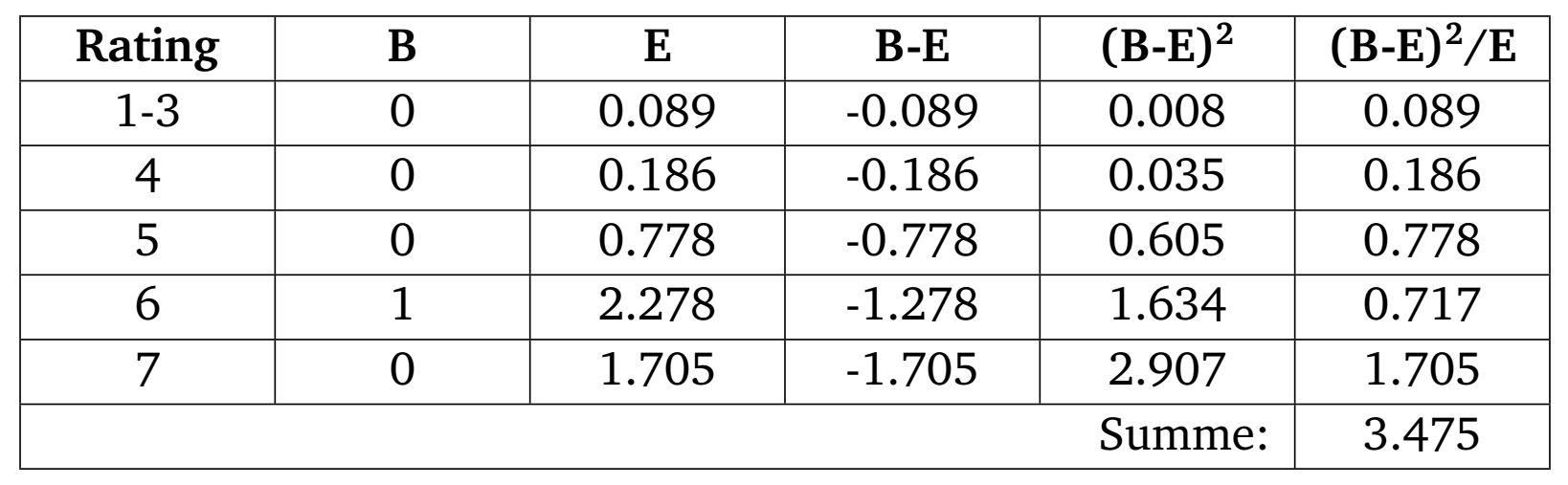 Eine Kontingenztabelle wird erstellt. Dabei werden die in der spezifischen Bank beobachteten Ausfälle (B) mit den aus dem Vergleichspool erwarteten Ausfällen (E) verglichen. E pro Ratingklasse berechnet sich wie folgt: \[E = \frac{\text{Anzahl Ausfälle in Vergleichspool}}{\text{Anzahl Schuldner in Vergleichspool}}\cdot \text{Anzahl Schuldner in spezifischer Bank}.\] Die Kontingenztabelle hat dann folgendes Aussehen: