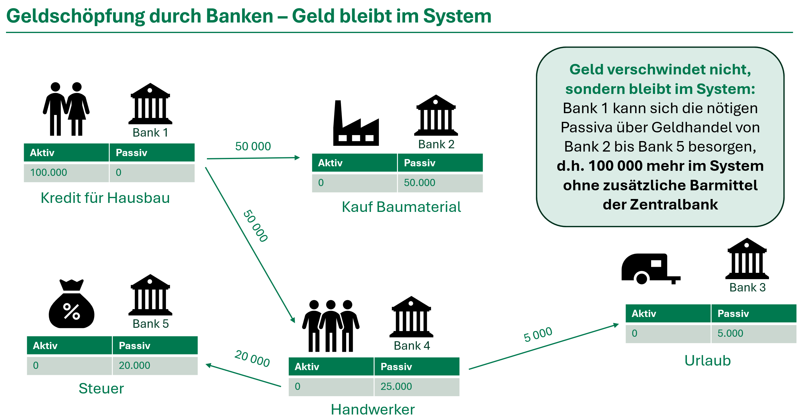 Ein Beispiel: Siedler 1 kauft von Siedler 2 ein Grundstück und finanziert den Kauf mit einem Kredit der Bank A. Die Bank belastet das Konto von Siedler 1 und bucht den Betrag als Guthaben auf das Konto von Siedler 2 – es entsteht neues Buchgeld. Kauft Siedler 2 von diesem Geld ein Fahrzeug von Siedler 3, wird das Guthaben von Siedler 2 auf Siedler 3 übertragen – das Buchgeld bleibt im Kreislauf.
